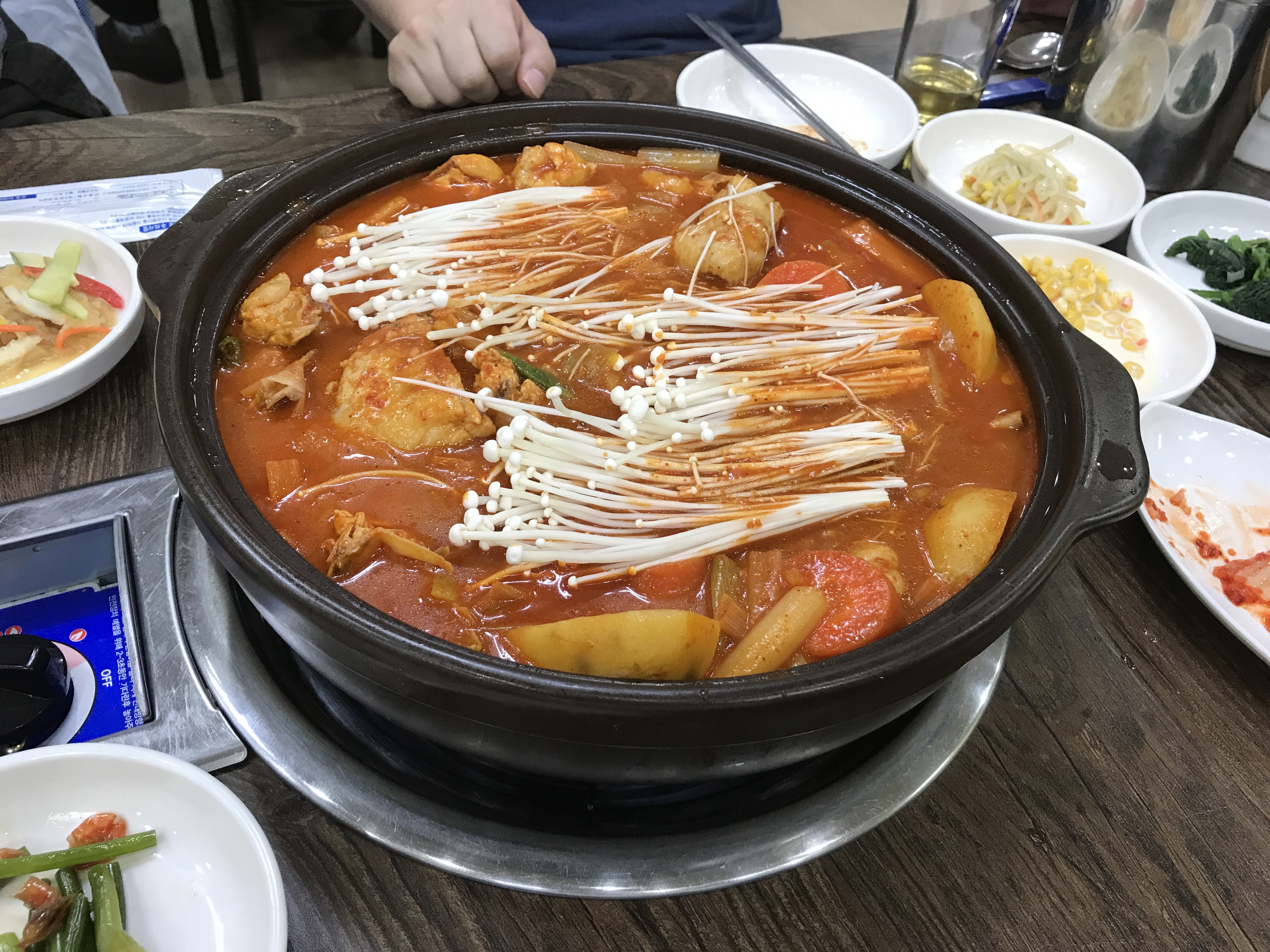 I mostly eat to live, and I love to live. On a recent visit to Cheonan, I had dinner with some colleagues. We chose chicken stew (dakdoritang) from a small, local Korean style restaurant: 촌동네 (or Chon dong ne). By ‘Korean style,’ I mean you sit on the floor at your table. This is normally not a problem even at 189cm tall, but at the moment, I have patella tendonitis in the right knee.